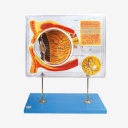眼示教放大模型置于透明有机玻璃盒内, 为眼球正中切口后的半侧眼球, 可观察眼球正中矢状切面和半侧眼球的外部结构。模型可显示眼球的解剖(包括眼球壁和内容物)、眼副器(包括眼睑、结膜、泪器和眼球外肌)、视网膜神经细胞的显微结构和检眼镜眼底检查视网膜图像等。